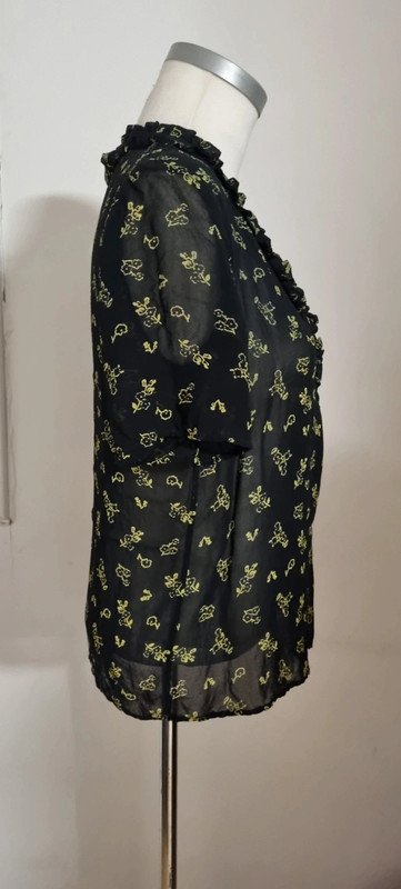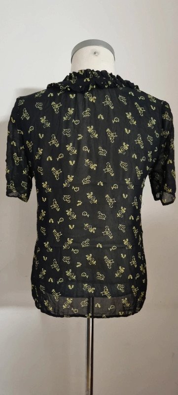 Top noir, avec motifs petites fleurs jaune, taille 36, en très bon état.