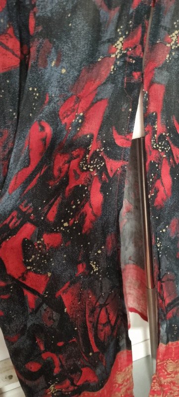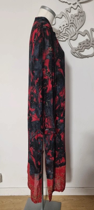 Tunique longue, boutonnée devant à moitié, ensuite reste ouverte et aussi sur les côtés, taille 3, en très bon état.
